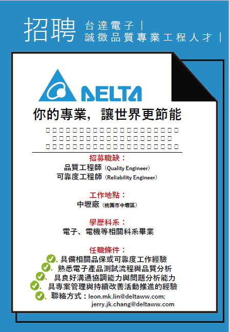 招聘 台 達 電 子 |誠 徵 品 質 專 業 工 程 人 才 |